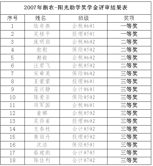 2007年浙农-阳光助学奖学金评审结果