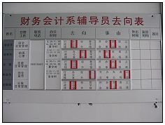 为了加强辅导员队伍建设,增强辅导员工作责任意识,增大辅导员工作的透明度,提高工作效率,避免学生盲目寻找、空等,浪费时间甚至造成误会,从而更好地为学生服务,财务会计系出台辅导员去向表。该表具体分为辅导员姓名、分管工作、联系电话、办公事件、去向、事由、外出时间、返回时间,地点为辅导员办公室门口。