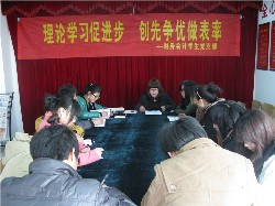 为深入开展“创先争优”活动,建设学习型党支部,我学生党支部系组织在校学生党员于2011年3月22日下午,在35幢党员之家开展“理论学习促进步,创先争优做表率”为主题的学习讨论会,此次会议由学生党支部组织委员高铉萍同学主持,在校预备党员、入党积极分子参加。