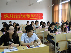 2011年5月9日,财会系与太平人寿浙江分公司多元行销部合作进行的“经贸订单班”在我院举行了隆重的开班仪式。与会的领导主要有太平人寿浙江分公司总监李波,系主任潘上永教授以及金融保险教研室、投资与理财教研室老师。