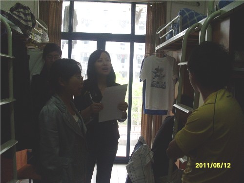 此次卫生着重抽查36幢男生寝室和32幢的女生寝室。抽查的内容包括地面卫生、被褥的叠放、桌面整洁等情况,王老师对在场的寝室长和学生干部及入党积极分子提出要求,希望寝室长和学生干部及入党积极分子可以在同学中起积极带头作用,维护寝室卫生,以寝室成员共同的努力、全新的姿态迎接示范建设中期评价暨人才培养评估工作。