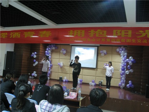 晚会伊始“助管风采”节目播放了助管部活动影集,让大家了解助管部的心路历程。之后由王红英同学带来一曲《夏天的风》,让在场的同学都陶醉在优美的歌声中。随后的本系优秀自强学生——会计093周建炜同学和金融保险092诸佳丹同学的事迹,让大家了解了自强学生背后的辛酸苦乐,他们面对生活、面对学习的积极态度和精神让大家为之动容。紧接着,上届助管部长林敏同学也来到晚会现场,向大家介绍她的实习经历及经验,并在主持人的要求下演唱了《青藏高原》,将交流会推向高潮。之后的手语、励志朗诵、B-BOX等一系列表演,赢得场下阵阵掌声。