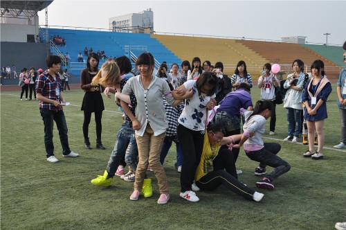 此次活动以团结、友谊、合作为主题,以班级为单位,每班派10名同学参加,共12个代表队。下午2时,活动正式开始。在主持人的带领下,每个队员喊出自己队响亮的口号:“会计一班,非同一班”“会5会5,永远飞舞” …同学们个个斗志昂扬,势如破竹。在第一个环节牵手速递的哨声响起之后,同学们手牵手用自己的身体传气球,现场热闹非常。在快乐向前冲环节中,10名队员以两人三足的形式排成一排,在跑到对面红线处之后,想办法迅速跑回起点,在拉拉队员的鼓劲下大家先后到达了终点。最后一个环节齐心协力站起来,10名队员手挽手背对背坐在地上围成一圈,在裁判的一声令下,每队同学迅速起身。场外同学高声欢呼,将气氛推向高潮。