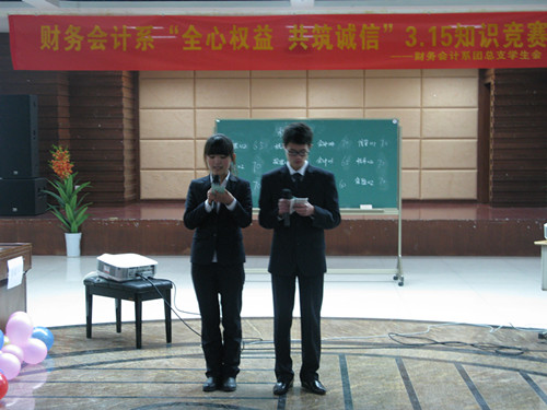 此次活动以“强化消费维权意识,服务和谐校园建设” 主题,共分4个环节:维权知识知多少、稳扎稳打、风险投资。各班参赛选手通过选择答题方式参与比赛,主持人读完题目及选项后,同学们积极作答。在表演环节中,保险101班殷昆同学为我们带来了一首《握不住的他》,赢得在座同学阵阵掌声。