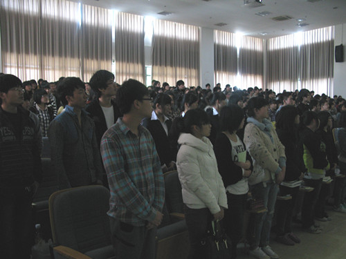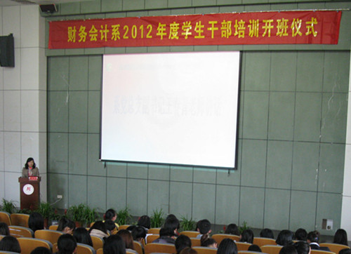 为提高学生干部的组织管理能力和创新实践能力,2012年3月27日下午1点30分,我系于图书馆报告厅举行财务会计系2012年度学生干部培训开班仪式,与会领导有财务会计系系主任、党总支书记潘上永教授、系党总支副书记王春青老师、系团总支副书记夏欢老师以及系辅导员金莉莉老师、李海勇老师、张译尹老师,大一大二学生干部与会参加。