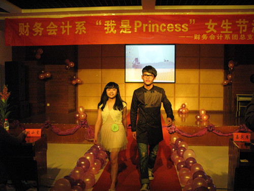 2012年3月27日下午6点,财务会计系女生节系列活动——“我是Princess”在我校学生活动中心隆重举行。院学生处胡小爱老师、财务会计系团总支副书记夏欢老师、财务会计系辅导员张译尹老师、院学生会主席邵辉、财务会计系团总支副书记兼学生会主席黄永煌、国际贸易系团总支副书记兼学生会主席郭丽娜、人文旅游系学生会主席张湘、应用工程系学生会主席杨莹莹、工商管理系学生会主席王杰、信息技术系学生会主席何宝雄、院女生部部长谢玲璐担任本次活动的嘉宾评委。
