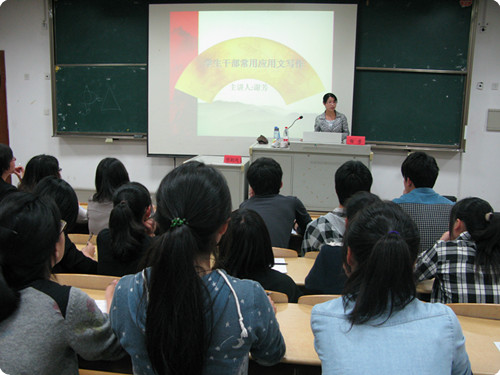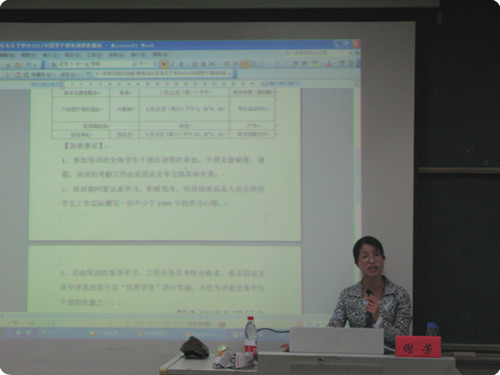 为切实提高我系学生干部工作水平和写作能力,我系于2012年4月25日下午6时在1号楼109举行第六次学生干部培训。此次培训主题为“学生干部常用应用文写作”,由人文旅游系副主任谢芳老师主讲,总辅导员夏欢老师,辅导员张译尹老师出席,系学生会团总支各部门100余名成员参加。