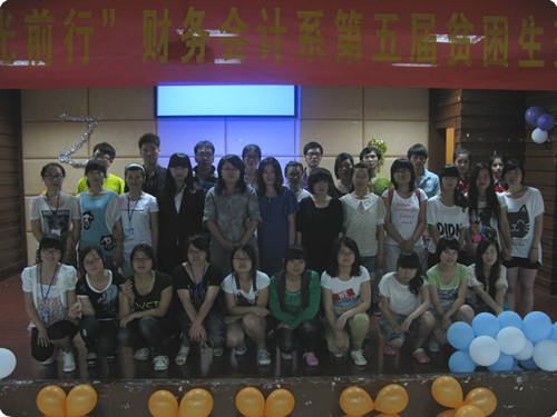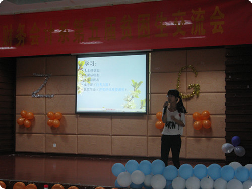 2012年5月28日下午6点,财务会计系助管部在学生活动中心举行了坚定方向阳光前行——财务会计系第五届贫困生交流会。我系党总支副书记王春青、国际贸易系辅导员章荣、我系总辅导员团总支副书记夏欢老师、系辅导员金莉莉老师和张译尹老师出席。