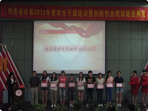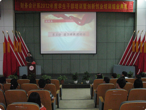 2012年6月19日下午三点于图书馆报告厅隆重举行财务会计系2012年度学生干部培训暨创新创业培训结业典礼。财务会计系系主任潘上永教授、系党总支副书记王春青老师、副主任李国辉老师、系总辅导员夏欢老师、系辅导员金莉莉老师、李海勇老师、张译尹老师出席,所有结业成员与会参加。