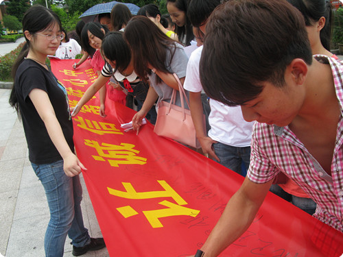本次活动以在“让舞弊远离校园让诚信常驻心中”的红色横幅上签名的形式展开,活动现场同学们积极参与,表示对诚信考试的信心,以诚信为荣,以作弊为耻。