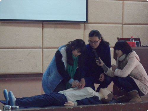 随后冯月红医师为大家带来急救方面的知识,主要是CPR心肺复苏法的应用,在突发情况发生时,施救者应注意心脏按压的位置、手势以及力道、速度,人工呼吸的方式、止血的包扎等,进行急救。随后冯医师邀请了在场同学上台做示范,并指出需改进的地方,现场气氛活跃。