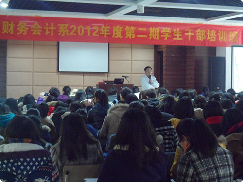 2012年12月18日下午1点,财务会计系第二期学生干部培训在学生活动中心举行,本次培训围绕大学生医保以及急救知识展开,由陈宏雷医师、冯月红医师担任主讲。我系总辅导员兼团总支副书记夏欢老师、辅导员张译尹老师、系团学部长、大一各班班委聆听。
