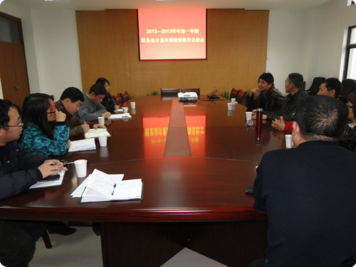 1月15日下午,财务会计系在系会议室召开了2012/2013学年第一学期外聘教师教学总结会议,财会系本学期的外聘教师及系部教学管理人员参加了会议,会议由系主任潘上永教授主持。