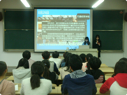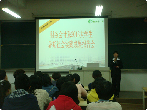 2013年10月24日下午四点三十分,财务会计系2013大学生暑期社会实践成果报告会在2号楼405室举行。系团总支书记夏欢老师、辅导员张译尹老师以及系暑期社会实践3支队伍的全体成员、个人分散社会实践活动学生、2013级班委代表参加了报告会。