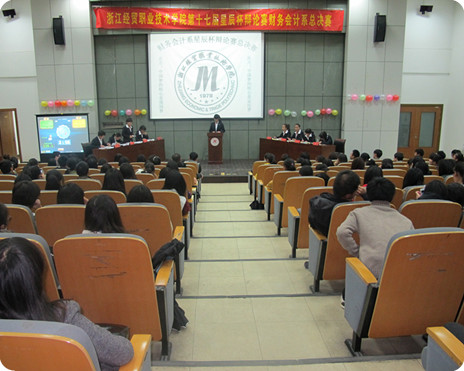 2013年11月12日晚上6:00,我系第十七届星辰杯辩论赛总决赛在图书馆报告厅拉开帷幕。此次比赛由系辅导员张刚老师、浙江金融职业学院口才协会会长贾详雪、我院辩论队队员兼2013年浙江省优秀辩手於茗荟、最佳辩手边培玲及我系辩论队领队倪浩担任评委。系团总支书记兼总辅导员夏欢老师、辅导员张译尹老师、团总支副书记兼学生会主席毕梦婷及国贸系辩论队领队刘淑娟莅临观赛;