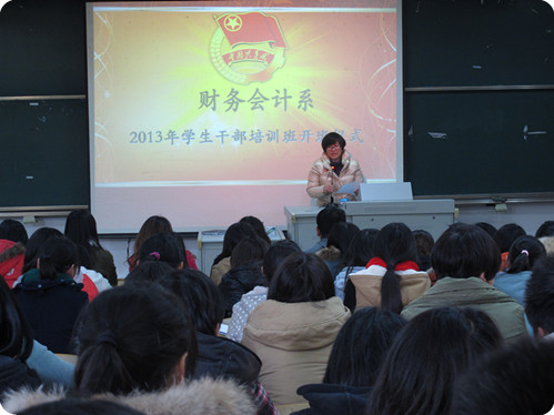 2013年12月10日下午2点20,财务会计系在1号楼101举行了2013年学生干部培训班开班典礼。出席本次开班典礼的有系党总支副书记王春青老师,系团总支书记兼总辅导员夏欢老师,系辅导员陈琴老师,许菁老师,张译尹老师和张刚老师。培训学员包括了财务会计系团总支学生会新任职干部及13级、12级各班班委。