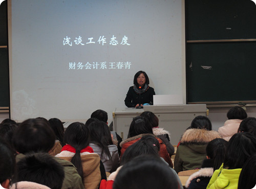 王春青老师主要围绕“一个统计,两种人生,三条警句”道出了态度的重要性。首先用哈佛的一项调查统计为引子,道出了态度的重要性;紧接着以积极和消极的两种人生态度让我们认识到积极的人生态度对成功是不可缺少的;随后王老师提出“态度决定一切”,“性格决定命运”,“习惯决定未来”三条警句,列举了大量发生在我们身边的真实事例,与同学展开讨论交流。她还以具体事件的处理引导学生认识到态度的重要性,