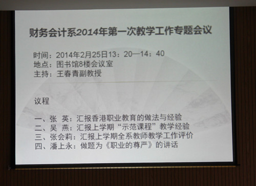 2014年2月25日下午,财务会计系举行了2014年度第一次教学工作会议,会议由系总支副书记王春青老师主持,学院卢显林院长、系主任潘上永教授及财务会计系全体教师出席了会议。