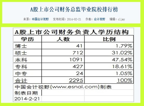 近日,中国会计视野网公布了一组上市公司财务总监学历和毕业院校统计数据,数据均来源于上市公司公开披露的高管信息。有2295人披露了个人的学历情况,大专学历近1/5。