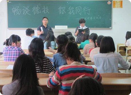 2014年5月13日中午12点30分,我系在4#203召开“畅谈德技,你我同行”的学生干部交流会。教学秘书李栋老师,系总辅导员夏欢老师,辅导员张译尹老师和张刚老师,文案部部长、学习部部长及大一各班班长、学委参加此次会议。