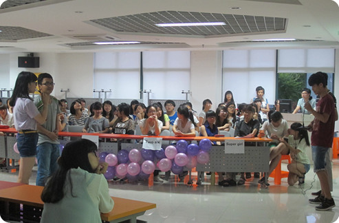 首先由两位主持人简单介绍了参赛的十组队伍的情况和比赛规则,活动共分三轮,环环相扣,现场气氛异常活跃。第一轮的游戏名为“你来比划我来猜”,限时一分钟,各队两两一组,在同伴的提示中猜出正确的答案,按正确答题数排名次。第二轮游戏是“画画”,选手们根据主持人给出的词语,在规定的时间内画出和该词语对应的图画。最后进入的游戏是“风险投资”,每组按前两轮排名自行选择挑战不同分值的题目,在经过三轮答题后,很多落后的队伍成功实现逆袭。