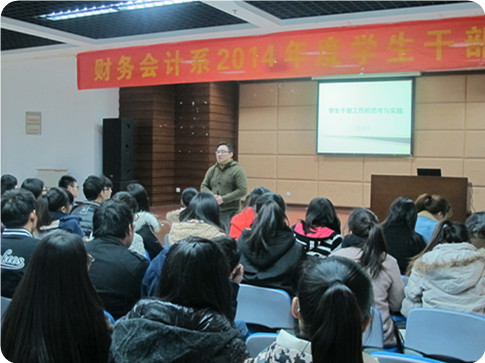 12月16日下午,财务会计系在学生活动中心举行了“学生干部培训之学生干部工作方法培训”专题讲座,院学生处副处长金初冬老师主讲,我系团总支副书记兼辅导员张译尹老师、团学部长及2014级各班班委参加了此次培训。