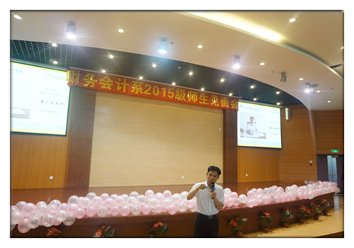 见面会上半场,老师们一改平日上课时严肃的面孔,李国辉老师和同学们畅聊梦想,祝愿大家放飞梦想、踏梦起航;张会莉老师希望同学们能够珍惜大学时光,学好专业知识,学有所成、学有所获;朱颖老师表示愿意成为同学们的知心姐姐,帮助大家排忧解难;蒋国强老师希望同学们利用空余时间多读书、多思考;李栋老师希望同学们能及时关注考试咨询,用心考试,其他老师依次上台送寄语。最后,系主任潘上永老师将来自9个不同省份的新同学以挥手的方式介绍给大家认识,潘老师还鼓励同学们在新的环境中利用网络、学会学习、积累知识、敢于创新、提高情商。老师们的话,一下子拉近了师生间的距离,解除了同学们的疑虑和担忧。