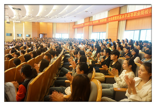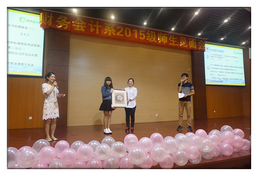 歌曲过后,学生手册知识竞赛随即开始,答对题目即可抽取神秘大礼,题目出自学生手册,在丰厚的奖品面前,同学们的热情格外高涨。有的同学抽到“免两次晚自习”欢呼雀跃;有的同学抽到“与辅导员老师共进午餐”羞涩垂首;更有同学凭着超群的反应力和绝佳的运气抽到终极大奖——党总支副书记朱颖老师亲手画的工笔画。到了集体抢答环节,比赛更加白热化,每个班派代表上台抢位子、抢娃娃,抢到的同学所代表的班级才有资格答题。10道抢答题结束后,会计153班以130分的最高分赢得了知识竞赛大奖:获得军训期间矿泉水50箱的奖励!最后在会计157班童晨露同学悠扬的笛声中、在所有新生热烈的掌声中,师生见面会圆满落下帷幕……