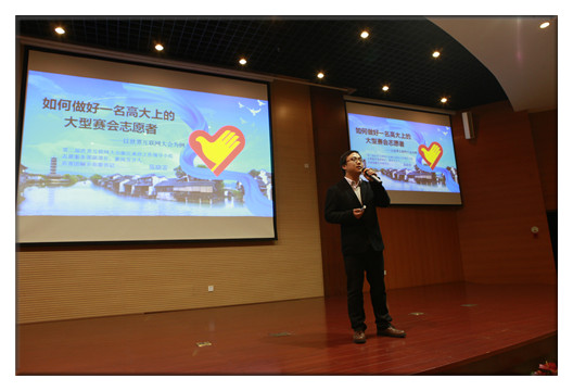 陈书记以在第二届世界互联网大会中接待“习大大”、梅德韦杰夫等国家领导人的具体实例、实用的经验分享、亲切的互动交流向大家娓娓道来,要成为一位“高大上的志愿者”就要不断培训演练、主动成长学习,就要“讲纪律”“讲完美”“讲大局”“讲方法”,这些都使在场的同学受益匪浅。陈书记还与同学们进行了“志愿者面试”环节的互动,请同学们分别上台用中、英文现场模拟志愿者的面试情况,“请一分钟自我介绍”、“通过参加互联网大会志愿服务,你想获得什么”、“What’s your hobby”、“Can you sing an English song”,互动中,有的同学介绍了自己想当志愿者的初衷、有的同学现场唱起了英文歌,精彩的互动引得场下观众阵阵掌声。
