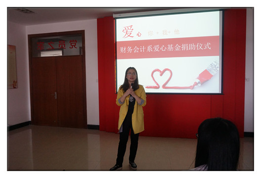 2016年4月19日下午2:00,财务会计系在图书馆八楼会议室举行了爱心基金捐助仪式。系党总支副书记朱颖老师,系辅导员兼团总支书记夏欢老师、系辅导员张刚老师参加了捐助仪式。