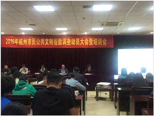 10月27日下午,由杭州市文明办、杭州市社科院举办的2016年杭州市民公共文明指数调查动员大会暨培训会在学院召开。杭州市文明办副主任刘婷,杭州市社科院社会学所副所长张祝平研究员,学院党委副书记卢显林等出席会议。浙江科技学院和我院参加课题组的师生参加。会议由杭州市文明办综合处处长朱一斌主持。