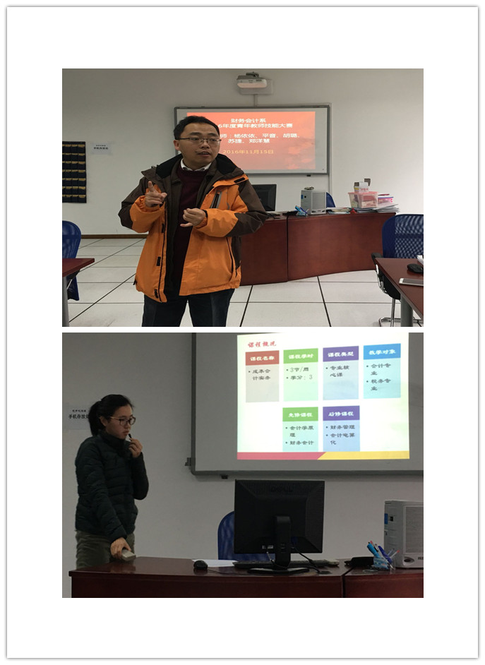 2016年11月15日,财务会计系举行了2016年度青年教师技能大赛。杨依依、平音、胡璐、郑洋慧、苏捷五位专业老师参加比赛,系主任潘上永、副书记朱颖、副主任张会莉、冯江涛以及财会系全体教师到场听取了五位老师的说课。