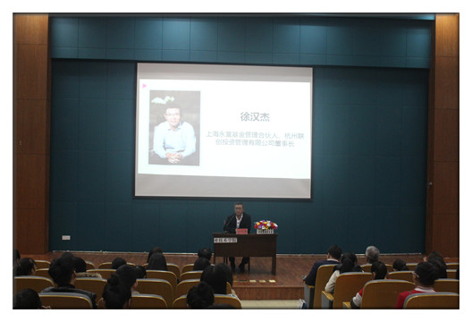 在接下来的开班讲座中,海永宣基金管理合伙人、杭州联创投资管理有限公司董事长徐汉杰为学员们带来了一堂十分“接地气”的“创业启蒙课”,他用APP开发、宠物行业兴起等生动的例子,从创业“背景”、“趋势”以及“新的商业模式与契机的发展”等方面说明了当代大学应该如何创业,“创业人是可爱而富有激情的,要将这种精神外化于日常的学习和工作中去”,徐董事长的话引来台下阵阵掌声。
