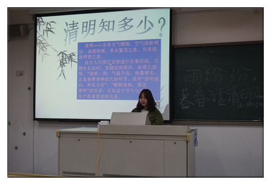 心理部成员首先从季节特点、传统习俗、诗词歌赋等方面向同学们全面介绍了清明节,让大家对传统民俗和文化有了更深刻的了解。此后,一段有关“中华传统美德”的视频播放触动了同学们对家人的思念之情,大家深受启发、并围绕中华传统“孝道”展开了充分讨论。此外,大家还在课堂上开展了“数七”、“猜谜语”、“成语连珠”和“火车开到哪”等游戏。