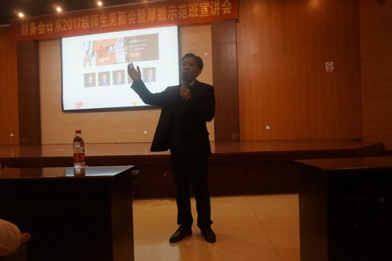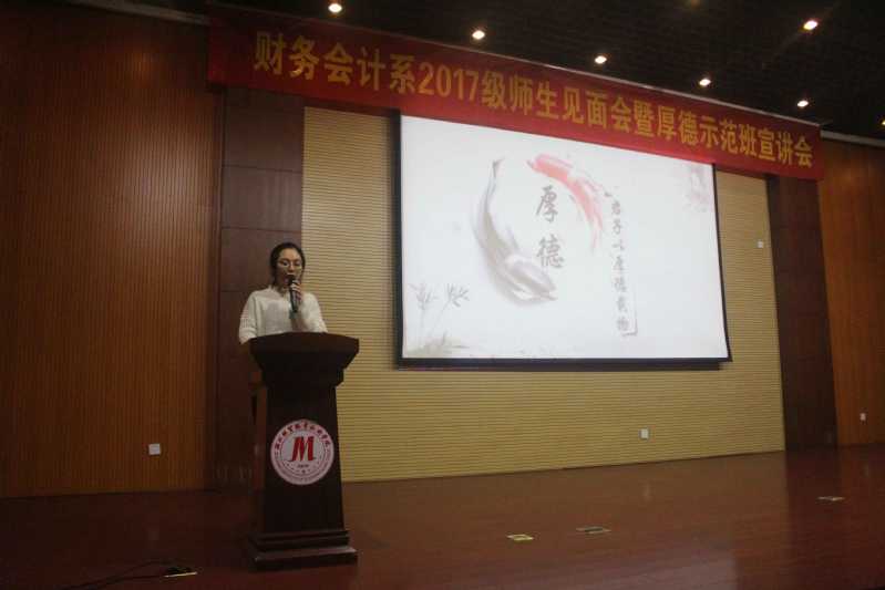 2017年11月21日下午,财务会计系在会议中心二楼以“青春助力十九大 奋力开启新征程”为主题,召开2017级师生见面会暨厚德示范班宣讲会。财务会计系领导、学科带头人、教研室主任、辅导员老师、班主任老师们以及2017级全体学生参加。