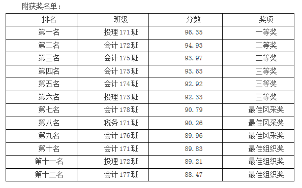 在系文艺部的《New View》火热开场舞蹈表演后,各个班级的展示正式开始。会计177班最先登台表扬,他们的节目《逐梦十九,点亮明天》用音乐、舞蹈、合唱展现团结就是力量;会计176班的《展现中国风貌,做合格会计人》主题表演将专业与才艺结合,最后用一篇《少年中国说》朗诵深深地震撼了在场的每一听众;《不忘来时路,弘扬传统文化》是投理171班的表演主题,同学们齐声诵读《关雎》、《论语》,配上优美典雅的古典舞,气势恢宏,充分展现了我泱泱中华的传统文化之美,让观众们沿着中国悠久的历史长河溯源。激扬的音符、华彩的篇章,最终,投理171班荣获此次比赛的冠军。