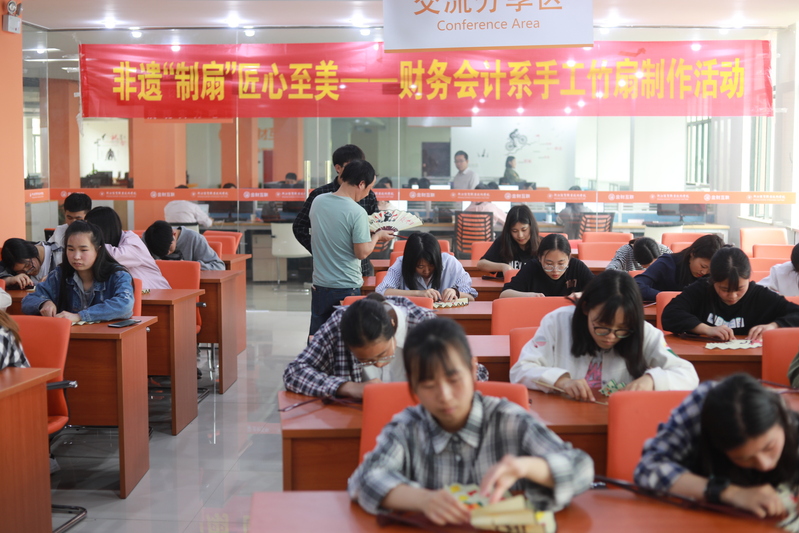 4月26日下午,财务会计系在“江浙沪大数据共享中心”会议室开展了“非遗制扇 匠心至美”手工折扇制作活动。系部30位同学跟随非遗竹扇传承手工艺人张北兴大师一起学习古法制扇工艺,亲身感受匠人们持之以恒的坚守和专注。