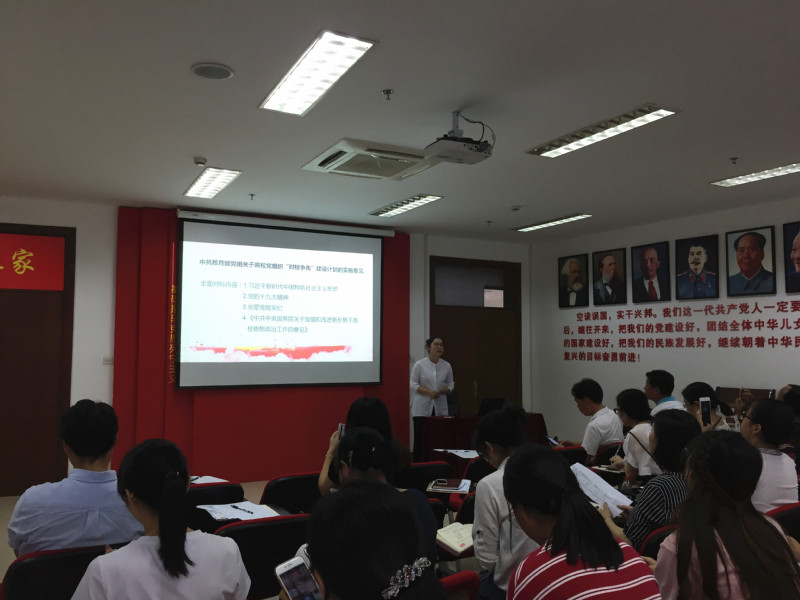 会上,财务会计系党总支书记潘上永以“习近平中国特色社会主义思想在实践中闪光”为主题,结合实际,介绍了“人类命运共同体”:从青岛峰会、孔子学院、一带一路看中国影响力,“新发展理论”:从“两山理论”、中美贸易、独角兽看中国经济发展,“总体国家安全观”:从朝鲜、台湾问题看中国在世界舞台上的大国外交,“保障和改善民生”:从精准扶贫、百年目标看中国共产党的顶天立地等几大方面。随后,该系党总支副书记朱颖围绕文件的具体要求、任务、内容带领全体师生党员重点学习、深入解读了《中共教育部党组关于高校党组织“对标争先”建设计划的实施意见》和《中共教育部党组关于高校教师党支部书记“双带头人”培育工程的实施意见》。