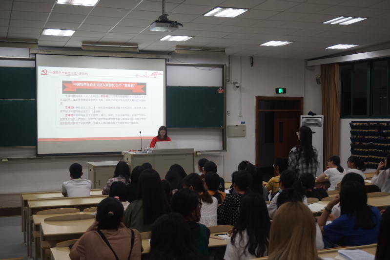 课上,吕丽丽以“认真学习党章,做合格党员”为主题,介绍了中国共产党的入党流程、党章以及相关的理论知识;鲍丽婷从十九大出发,以报告中的关键词为切入点,引导同学们深入学习理论、贯彻十九大精神;而沈元胤是为同学们仔细介绍了从推优至成为合格党员的党员发展流程,使同学们胸中有目标、心中有计划。
