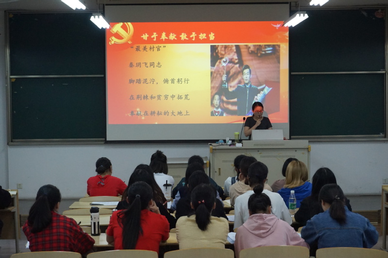 李若羚老师讲以“不忘初心,逐梦前行”为主题为大家讲解红船精神,这是一种开天辟地、敢为人先的首创精神,坚定思想、百折不挠的奋斗精神,立党为公忠诚为民的奉献精神。接着,李若羚老师给大家介绍了我系邱正山党员老师教书育人、爱岗敬业的优秀事迹,同时李老师还告诫同学们作为当代青年要有理想、有担当,有坚定的信仰和立场,还要有清醒的头脑、正确的政治站位和不服输的拼搏精神。刘学思老师党课的主题为“甘于奉献,敢于担当”,她以《人民的名义》为引子,为大家介绍了时代楷模廖俊波、耶鲁村官秦玥飞,回归实际生活,刘老师又为大家介绍了潘上永老师、朱颖老师、郑宝凤老师身为优秀共产党员的奉献和担当。