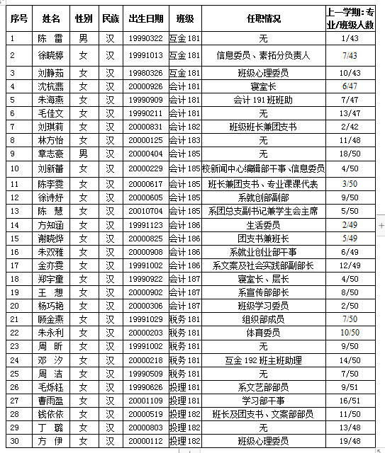 根据《中国共产党发展党员工作细则》(中办发〔2014 ] 33号)、《浙江经贸职业技术学院发展党员工作办法》有关规定,财务会计系会计党支部、理财党支部、税信党支部于2019年10月29日召开支部委员会会议讨论通过,拟确定陈雷等30位同志为入党积极分子,并予以公示,接受广大党员、群众监督。