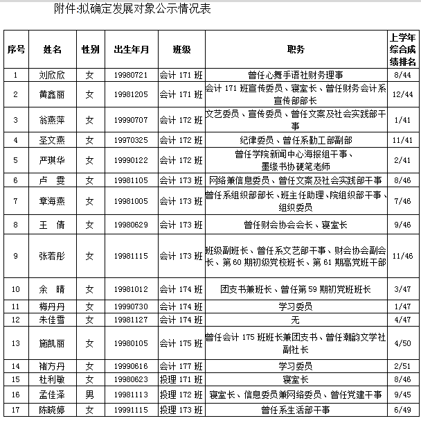 根据《中国共产党发展党员工作细则》(中办发〔2014 ] 33号)、《浙江经贸职业技术学院发展党员工作办法》有关规定,财务会计系会计党支部、理财党支部、税信党支部于2019年10月29日召开支部委员会会议讨论通过,拟确定刘欣欣等17位同志为发展对象,并予以公示,接受广大党员、群众监督。