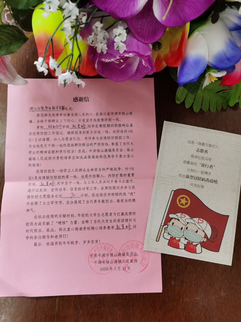 近日,中共平湖市独山港镇委员会、平湖市独山港镇人民政府给学院写来感谢信,对财务会计系税务181班赵李婷同学在寒假期间积极响应基层疫情防控工作倡议,踊跃投身家乡防疫一线的行为表示由衷的感谢。在疫情最危急的时刻,我系赵李婷同学主动请缨、第一时间加入了防控志愿者的队伍,认真参与了卡点值守、通行证发放、宣传劝导等工作,志愿服务时长共计70个小时,她的尽职尽责、勇敢担当充分彰显了财会学子的家国情怀和时代精神。