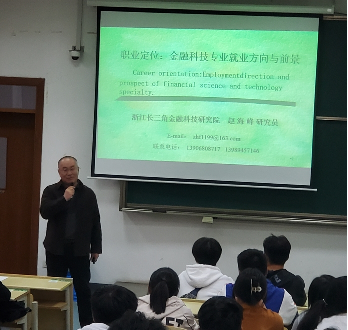 2021年10月26日下午,财务会计学院在1号楼209教室举办了题为《金融科技专业就业方向与前景》讲座,由浙江长三角金融科技研究院研究员、浙江海洋大学经济与管理学院赵海峰教授主讲,金融科技应用专业全体学生参加该讲座。