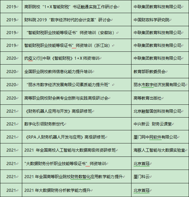 作为浙江省首批师资力量,参与1+X师资培训工作,围绕智能财税职业技能等级证书考核技能展开学习;作为主讲老师,先后承担线下浙江站的“1+X”等级证书师资培训,以及疫情期间的多期线上培训工作;为配合X证书考试工作,作为“1+X”师资团队成员承担学生考试培训,通过率达全国前列。