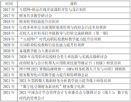 2019年国家实施1+X证书制度后,她积极参加1+X职业技能等级证书学习,获得了政府财务与会计机器人应用职业技能等级证书初级培训讲师资格。2021年会计专业更名为大数据与会计专业后,她积极拥抱专业的变化,积极参加大数据课程的学习,共参与了财务数字化、财务数智化应用、大数据财务分析、财务转型技能提升、财务共享等5门大数据相关课程的培训。