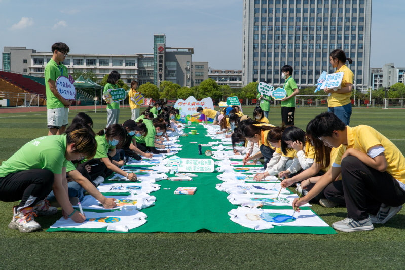 在世界地球日前夕,财务会计学院以“保护美丽地球 助力绿色亚运”为主题,在学校体育场上开展的一场手绘环保T恤活动。在蓝天白云下,同学们用手中的画笔尽情描绘。绿树成荫、流水潺潺展现的是美丽清洁而又生机勃勃的地球家园;北极熊、犀牛、蓝鲸的动物形象栩栩如生,人与动物和谐共生的场景跃然眼前;干涸的大地、污浊的空气和充满垃圾的海洋,这想象中的画面给人警示:守护地球就是守护人类自己。用艺术的形式、环保的元素、多样的图案、缤纷的色彩,大家表达着对构建人与自然生命共同体的认同,表达着对低碳减排、生态发展、美好未来和绿色亚运的期盼。