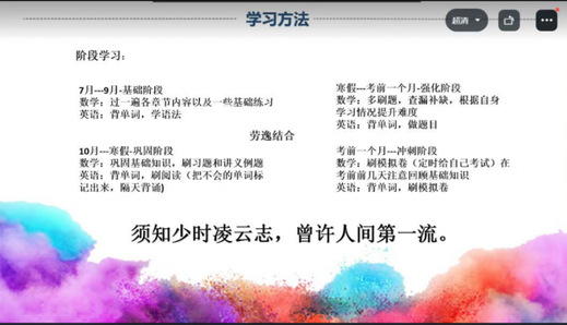 会上,蒋杰和孟繁荣分别从考试内容、计划安排以及心态调整等方面介绍了备考过程,蒋杰强调英语复习单词是基础,要做好词汇量的积累,孟繁荣提醒大家学习要注重劳逸结合,提高学习效率。邵烨从“明确目标”、“确定方向”、“付出行动”、“坚定信心”、“正常发挥”五个方面向同学们分享了备考经验,并针对备考过程中容易出现问题的环节和大家进行了交流,他鼓励同学们要坚定信念、勇往直前。童哲斌则对英语和数学两门课作详细的复习经验分享,他提出要把握好复习节奏和学习计划,并向大家推荐了提升学习效率的APP。