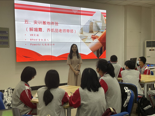 始业教育活动在经管实训基地举行。学院副院长吴燕代表学院热烈欢迎高一新生到校实地见学,向他们详细介绍了学院及大数据与会计专业情况。毕业于萧山一职的学生代表王美淋和诸金雨入学我校的所学所感,让他们对学校有了更深入的了解。解媚霞和乔凯丽老师携会计技能和智能财税国赛获奖学生带领他们体验AR虚拟仿真教学、RPA财务机器人和Powerbi大数据分析等,使同学们对数字化时代下会计职业的工作环境、工作内容有了形象化、立体化的认识。周草老师带着他们参观校园并开展了素质拓展活动。