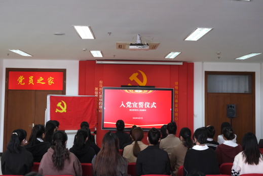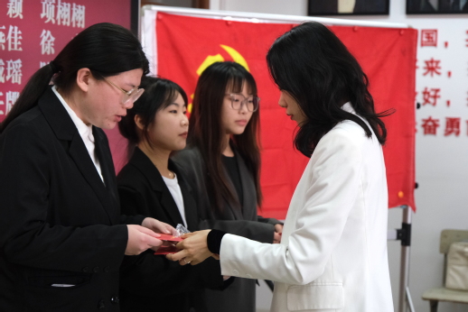李鑫璐为预备党员们佩戴党徽,发放党章。随后,领誓人带领各预备党员面向党旗进行庄严宣誓。铮铮誓言,拳拳红心,铿锵有力的誓言展现了预备党员们对党作出的庄严承诺。
